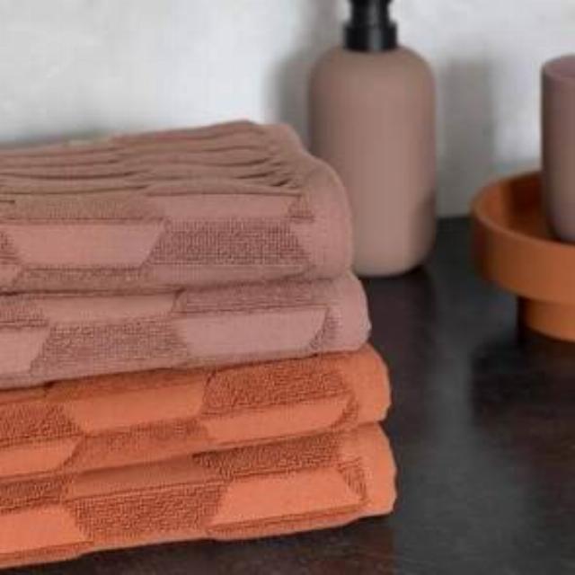 Linges de bain en coton, 3 coloris: brique, bleu argenté, vieux rose Formats: 35x55 / 50x95 / 70x133 ainsi que tapis de douche